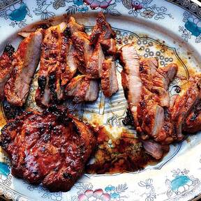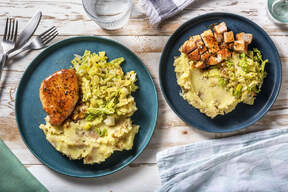 Honey Mustard Glazed Pork with Mash, Sauteed Leeks and Cabbage- Hummus