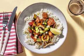 Baked Harissa Salmon with Roasted Veg Stew and Couscous