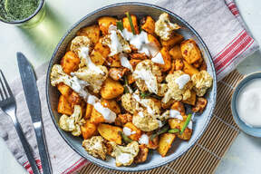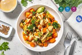 Spiced Yoghurt Coated Chicken with Roasted Squash, Cabbage, Broccoli and Curry Garlic Sauce