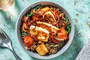 Pan Fried Haloumni with Caramelised Red Onion and Lentils