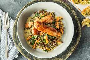 with Balsamic Lentils, Charred Courgettes and Garlicky Croutons