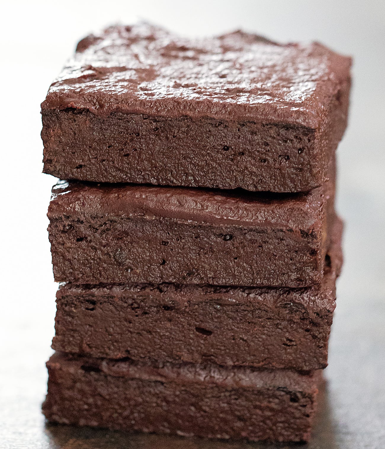 Bake for about 20-25 minutes. When the brownies are done, the surface should look dry and dark in color and the center should not be jiggly. However, the center should also not be completely set (i.e., a toothpick inserted will come up wet and if you press your finger gently on the surface you should feel that the center is still soft). Let brownies cool in pan. Then place into the fridge for 1-2 hours or until brownies are firm enough to cut.
