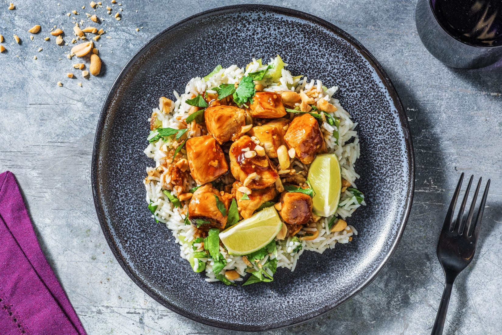 a) Divide the rice between plates and serve the sticky pork on top of it. b) Finish by pouring any sauce left in the pan over the top and scattering over the remaining peanuts and coriander. c) Top with the remaining lime wedges for squeezing over. Enjoy!
