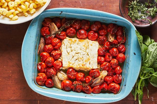 Place feta into centre of tomato mixture and drizzle top with remaining olive oil. Scatter thyme over tomatoes. Bake for 40 to 45 minutes, until tomatoes are bursting and feta is golden on top.