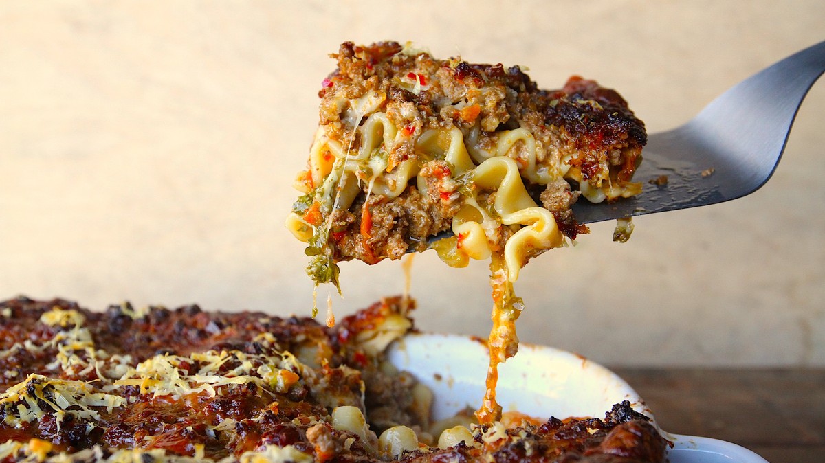 Ladle the meat sauce onto the bottom of your casserole dish, then lay down noodles, then another layer of meat sauce, then layer your cheese, then noodle and so on until your dish is full. Add chopped parsley to the middle layer and add grated part on the top layer.