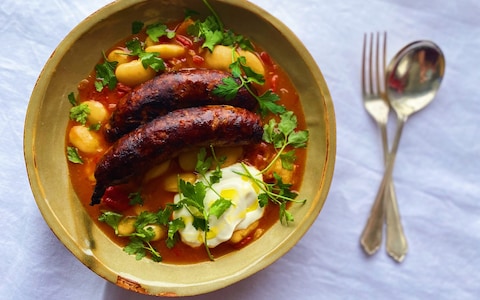 To serve, ladle the beans into a deep bowl and top with the sausages, a dollop of something creamy and a few sprigs of parsley.