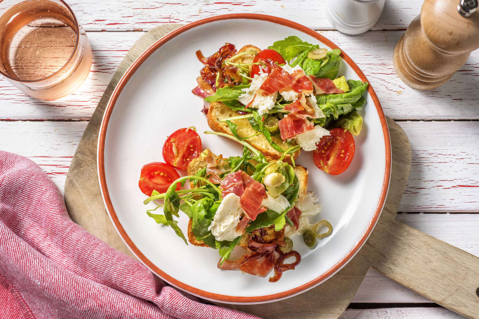 a) Place two ciabatta halves per person onto your plates. Divide the caramelised onion among the ciabatta halves. b) Top each half with a handful of the salad mixture. Drain the mozzarella and tear it into small pieces and place on top of the salad. c) Crumble the serrano ham into shards and arrange them on top. Enjoy!
