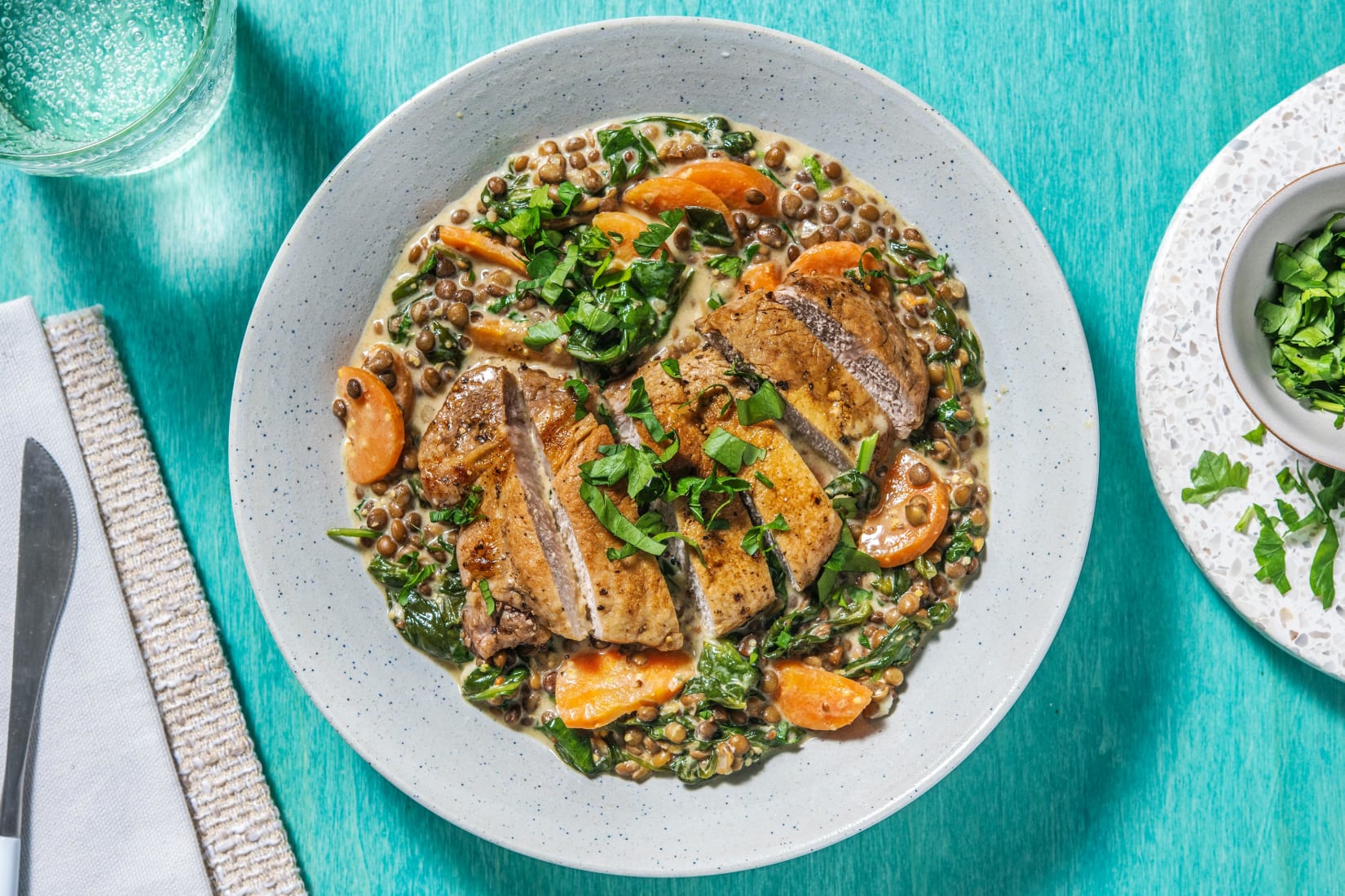 a) Mix any pork juices into the lentils, bring back up to the boil, then stir in half the parsley. b) Spoon the creamy lentils into your bowls. Top with the pork slices and a sprinkle of remaining parsley. Enjoy!