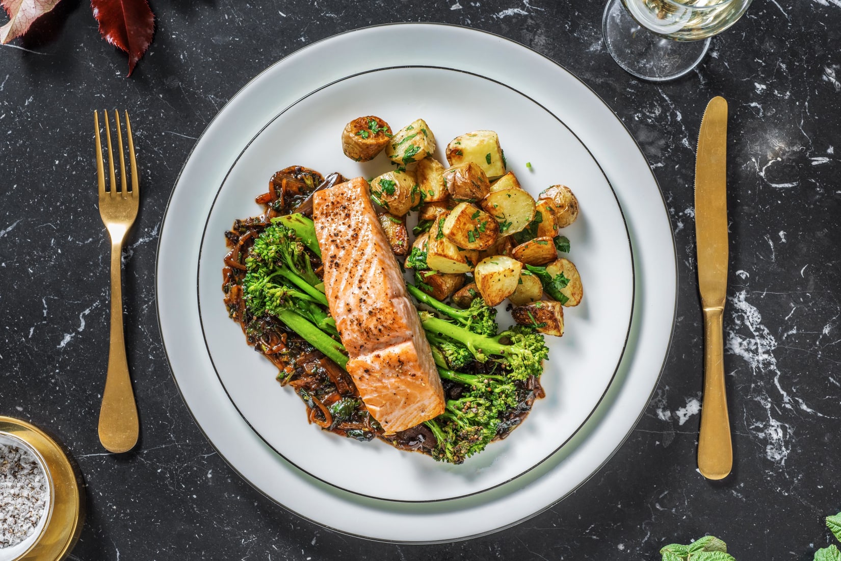 Warm up the sauce and stir in the butter so it melts. Spoon it onto your plate then arrange the tenderstem on the plate and top with the salmon. Toss the remaining parsley through the potatoes and serve them next to the salmon and veggies. Enjoy!