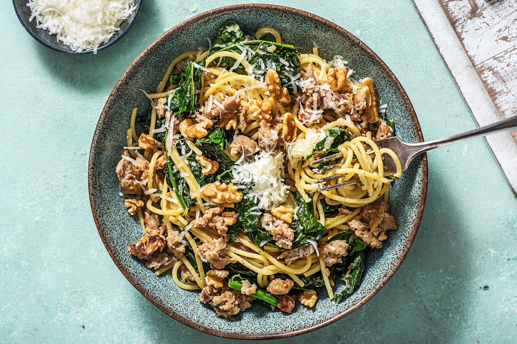 Bring a large saucepan of water to the boil with a pinch of salt for the pasta and cavolo nero. Meanwhile, heat a splash of oil in a large frying pan over medium-high heat. Add the sausagemeat and cook until starting to brown, 5 mins. Break it up into small chunks with a wooden spoon as it cooks.