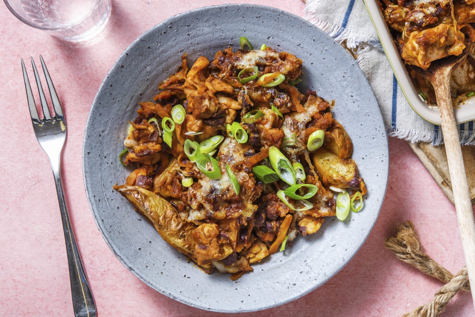 When the wedges are ready, transfer them to an ovenproof dish. Spoon the chicken mixture on top of the wedges. Sprinkle on the cheese and bake in the oven until the cheese is golden and bubbly, 5-6 mins. Remove from the oven, sprinkle over the spring onion and serve!
