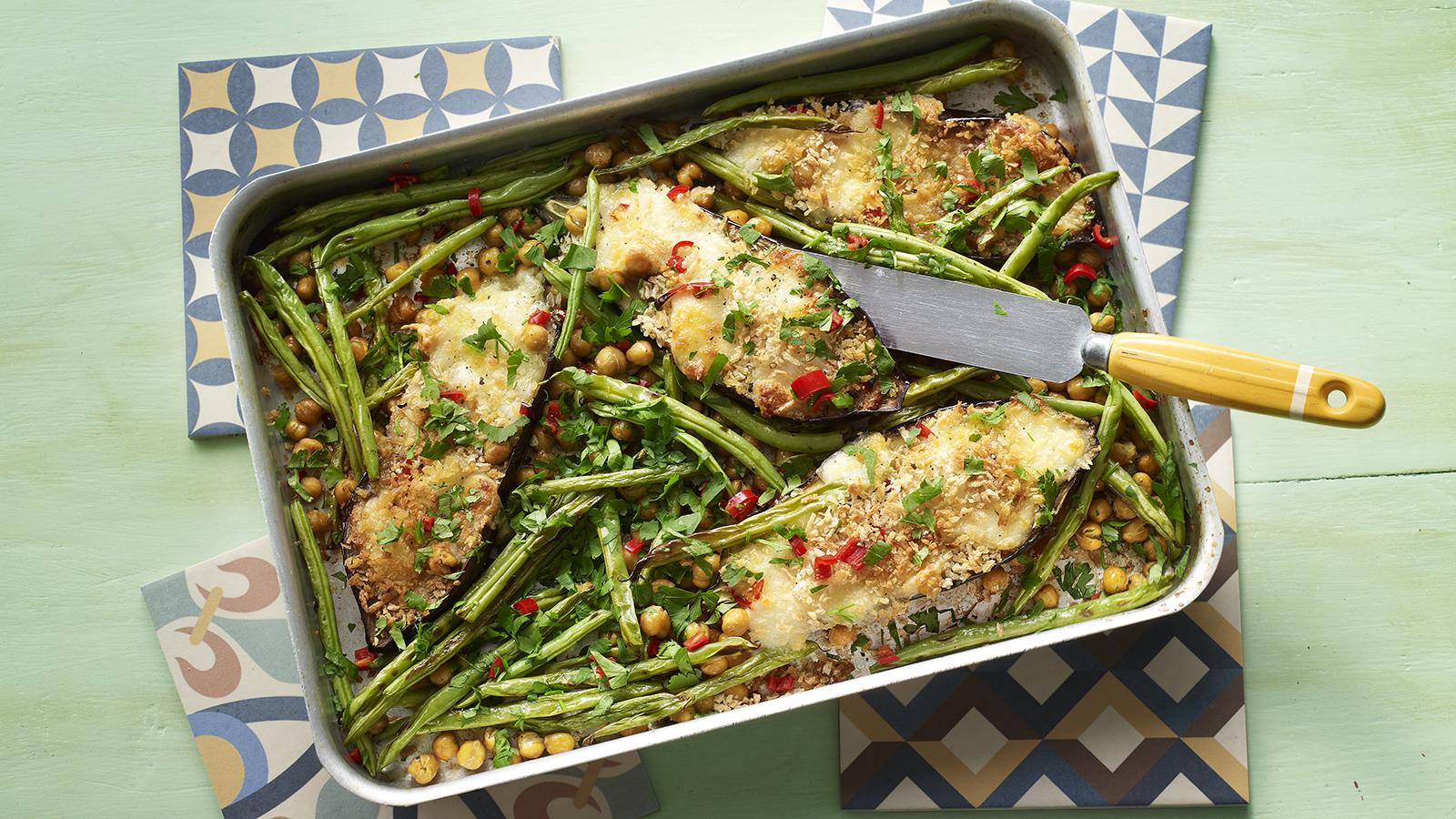 Add the green beans to the tin and mix to coat in the oil, adding a little more if needed. Cover the aubergine flesh with the torn mozzarella, a pinch of sea salt, the panko breadcrumbs and half the chilli. Cook for a further 30 minutes, or until the topping is crisp and golden and the aubergine flesh is soft.